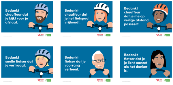 Meer dan 5000 campagneborden staan op zorgvuldig gekozen locaties verspreid over Vlaanderen. Minister Peeters geeft een woordje duiding bij deze nieuwe fietscampagne: “Deze campagne vraagt met een vriendelijke en positieve “bedankt-knipoog” aandacht voor specifieke situaties die gevaarlijk kunnen zijn voor fietsers. Daarbij kan het gaan over automobilisten die op het fietspad staan, afslaan zonder op de fietsers te letten of te weinig zijdelingse afstand houden bij het voorbijrijden van fietsers, maar evengoed over fietsers die in het donker zonder verlichting rijden, de voorrangsregels niet naleven of hun snelheid niet aanpassen in de buurt van fietsende kinderen of senioren.”