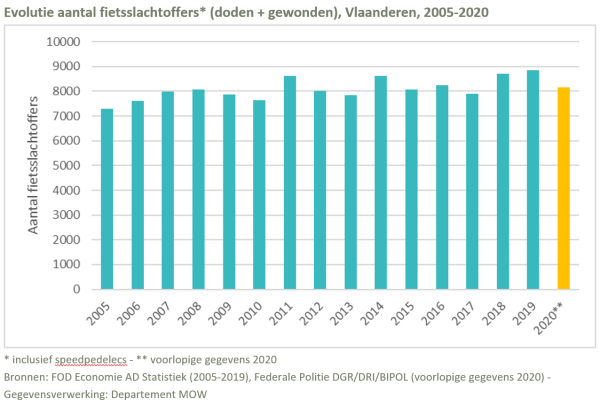 Volgens de eerste, voorlopige gegevens van de Federale Politie telde Vlaanderen vorig jaar 247 verkeersdoden, een daling met 18,8% ten opzichte van 2019. Het aantal gewonden nam met 21,7% af en bedroeg vorig jaar 22.341. Deze sterke dalingen houden uiteraard verband met de impact van de coronamaatregelen op onze mobiliteit. Ondanks de positieve cijfers werd de Vlaamse doelstelling om het dodental in 2020 te beperken tot maximum 200 echter niet gehaald. De globale cijfers maken duidelijk dat een verdere aanscherping van de verkeersveiligheidsmaatregelen in Vlaanderen nodig is om het aantal verkeersslachtoffers verder terug te dringen.