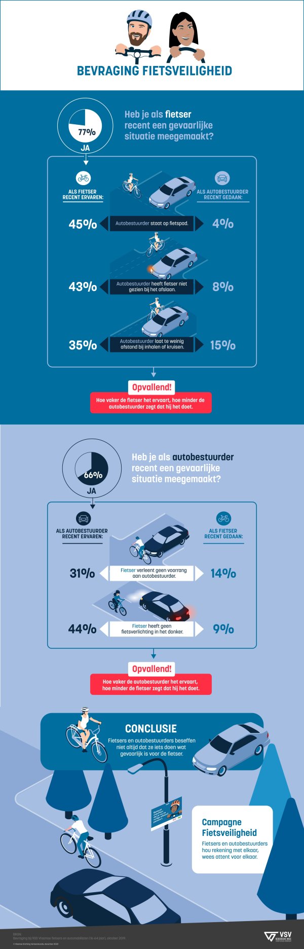 77% van de Vlaamse fietsers verklaart dat ze recent in gevaar kwamen door onveilig gedrag van automobilisten, zo blijkt uit onderzoek van de VSV (1). Omgekeerd geeft 66% van de autobestuurders aan dat ze recent een gevaarlijke situatie met een fietser hebben meegemaakt (zie infografiek). Opvallend: hoe vaker de ene groep een bepaald risicogedrag rapporteert, hoe minder vaak de tegenpartij toegeeft zich onveilig te gedragen. Zo verklaart 45% van de in gevaar gebrachte fietsers dat dat gebeurde door een automobilist die op het fietspad stond, terwijl slechts 4% van de automobilisten toegeeft wel eens op het fietspad te staan. Omgekeerd zegt 44% van de autobestuurders dat ze in het donker werden verrast door een fietser zonder fietsverlichting, terwijl slechts 9% van de fietsers toegeeft wel eens zonder verlichting te rijden.