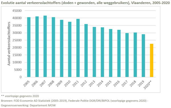 Volgens de eerste, voorlopige gegevens van de Federale Politie telde Vlaanderen vorig jaar 247 verkeersdoden, een daling met 18,8% ten opzichte van 2019. Het aantal gewonden nam met 21,7% af en bedroeg vorig jaar 22.341. Deze sterke dalingen houden uiteraard verband met de impact van de coronamaatregelen op onze mobiliteit. Ondanks de positieve cijfers werd de Vlaamse doelstelling om het dodental in 2020 te beperken tot maximum 200 echter niet gehaald. De globale cijfers maken duidelijk dat een verdere aanscherping van de verkeersveiligheidsmaatregelen in Vlaanderen nodig is om het aantal verkeersslachtoffers verder terug te dringen.