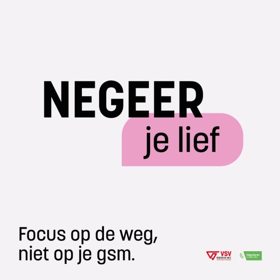 “Negeer je lief”, “Negeer je vrienden”, “Negeer je baas”, zo luiden de opvallende boodschappen die vanaf 2 mei op wegaffiches in heel Vlaanderen te zien zijn. De slogans maken deel uit van een nieuwe campagne die bestuurders aanspoort om te focussen op de weg, niet op hun gsm. Nieuw onderzoek van de VSV (Vlaamse Stichting Verkeerskunde) geeft immers aan dat meer dan 8 op de 10 automobilisten achter het stuur wel eens met de smartphone bezig is. “Afleiding behoort nog steeds tot de 3 grootste killers in het verkeer. Je smartphone bedienen tijdens het rijden kan tot levensgevaarlijke situaties leiden. Doe het dus niet”, aldus Vlaams minister van Mobiliteit en Openbare Werken Lydia Peeters.